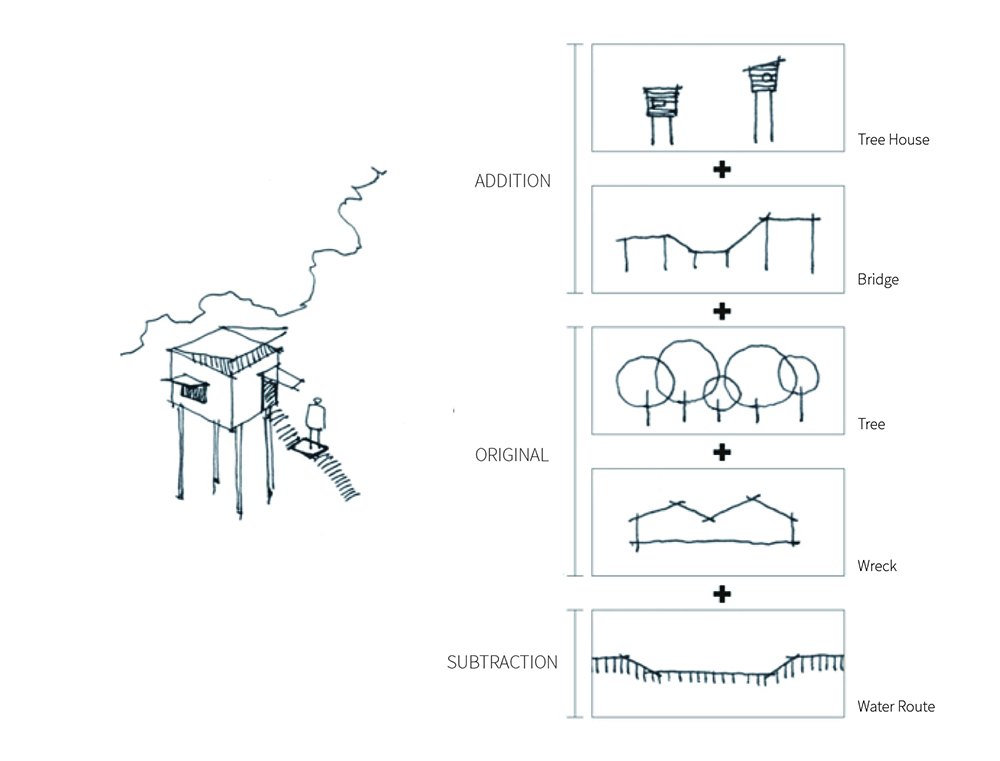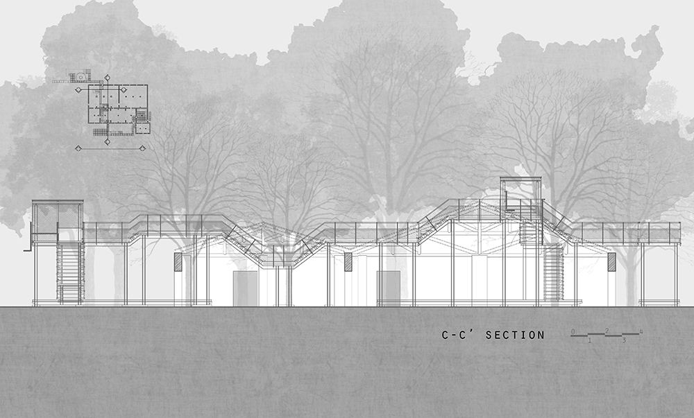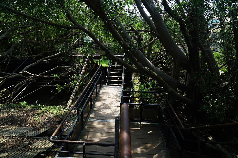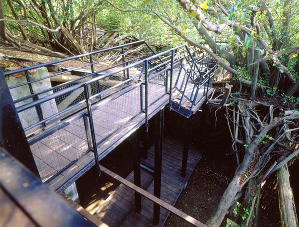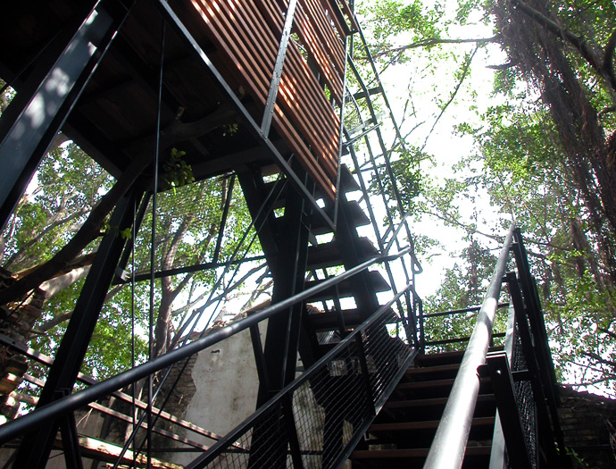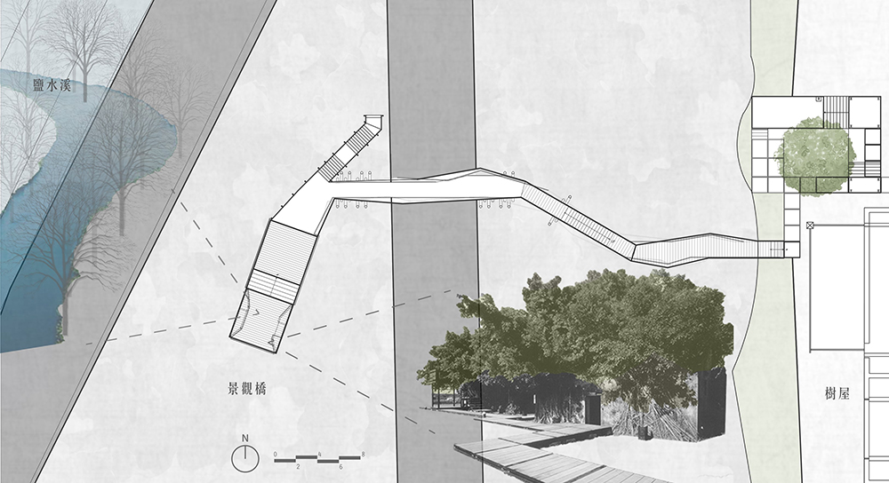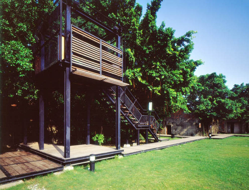 原有之地坪為泥土,紅磚及部分混凝土粗底,加上多年荒廢落葉、落葉及樹根佈滿全區,若要形成流暢的動線,除非全區更新地坪及屋頂,否則無法完全禁絕雨水及落葉,但如此一來,反而破壞了樹屋特色。對此我們設計了棧道的系統,可上可下,時左時右,並根據現場林勢,設置了三組昇於屋頂之上的觀景瞭望台,形成一處參觀者可以停佇環視的場所。這一組系統為可拆組的構件,只須於現場作組合安裝,得以降低對生態的干擾。