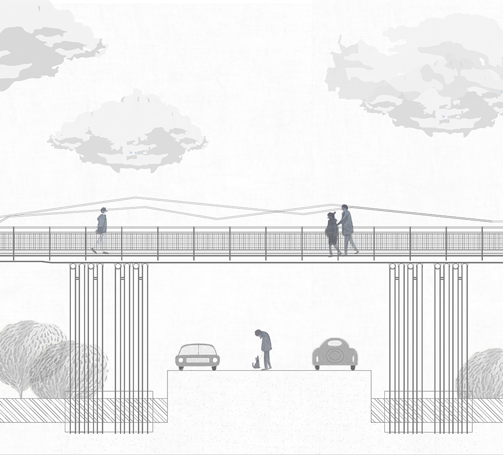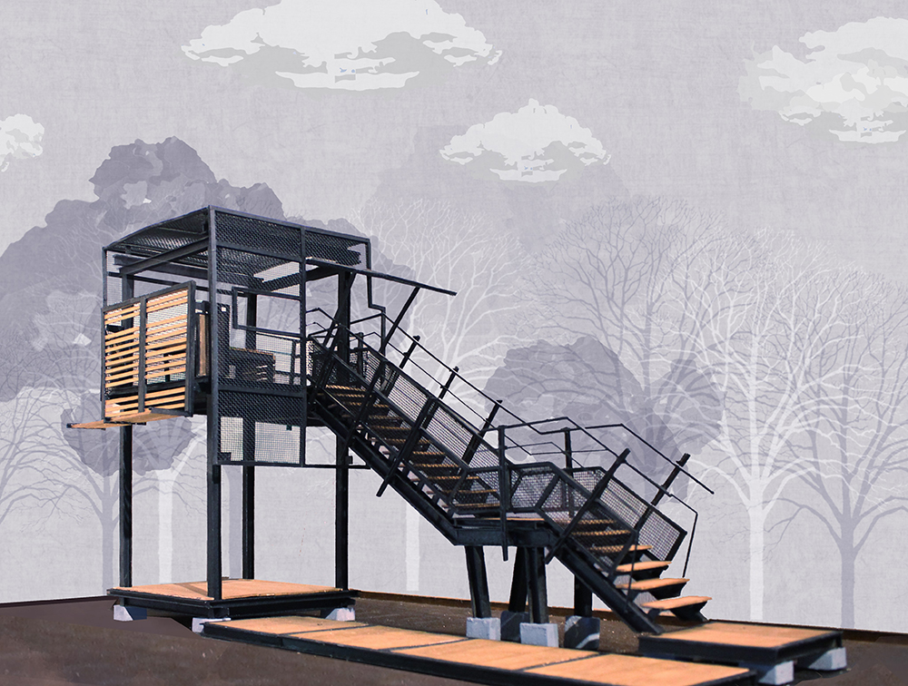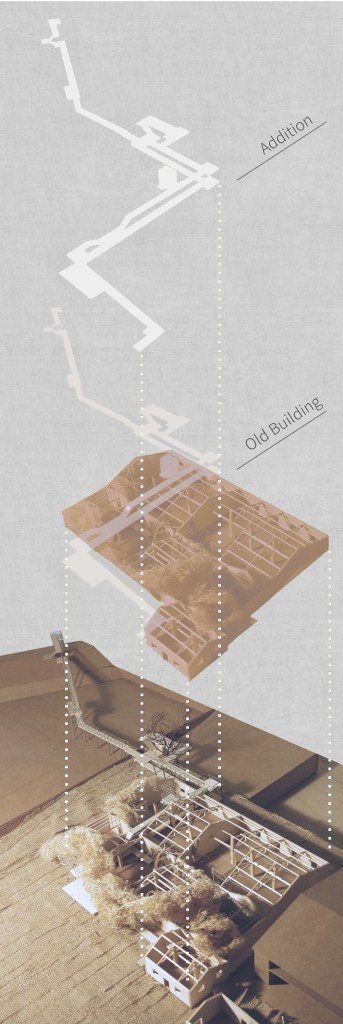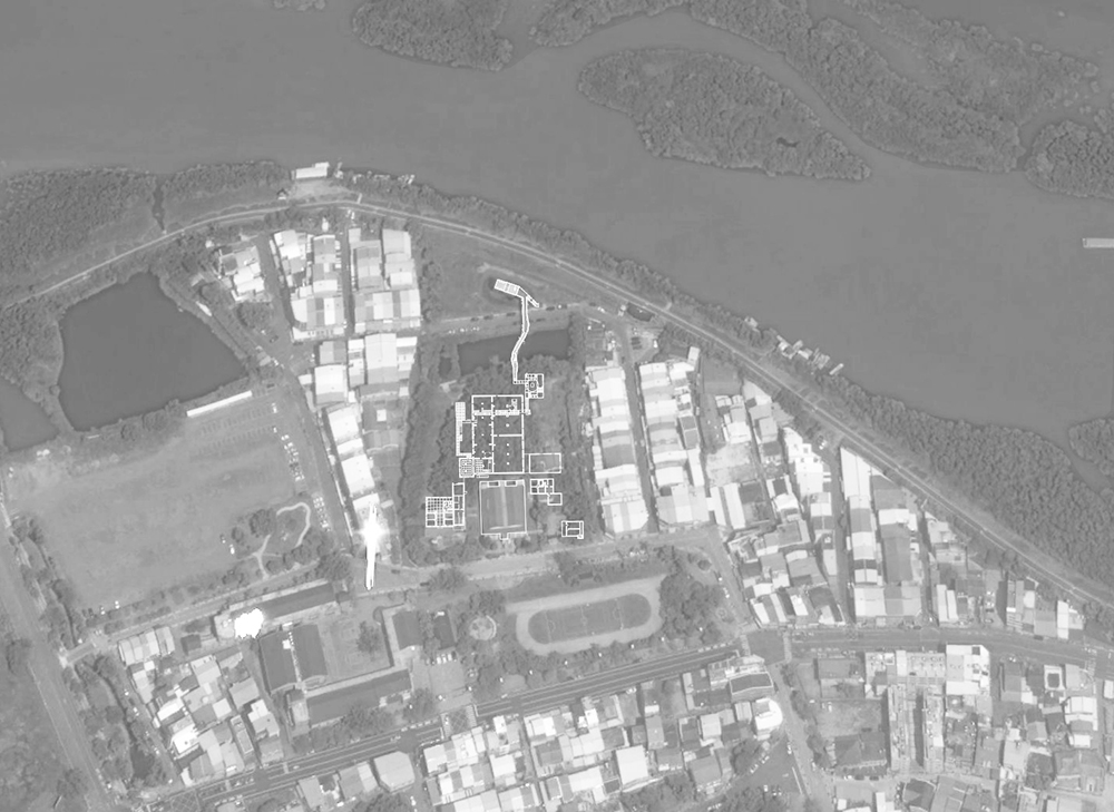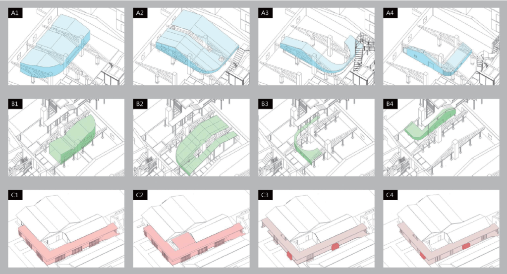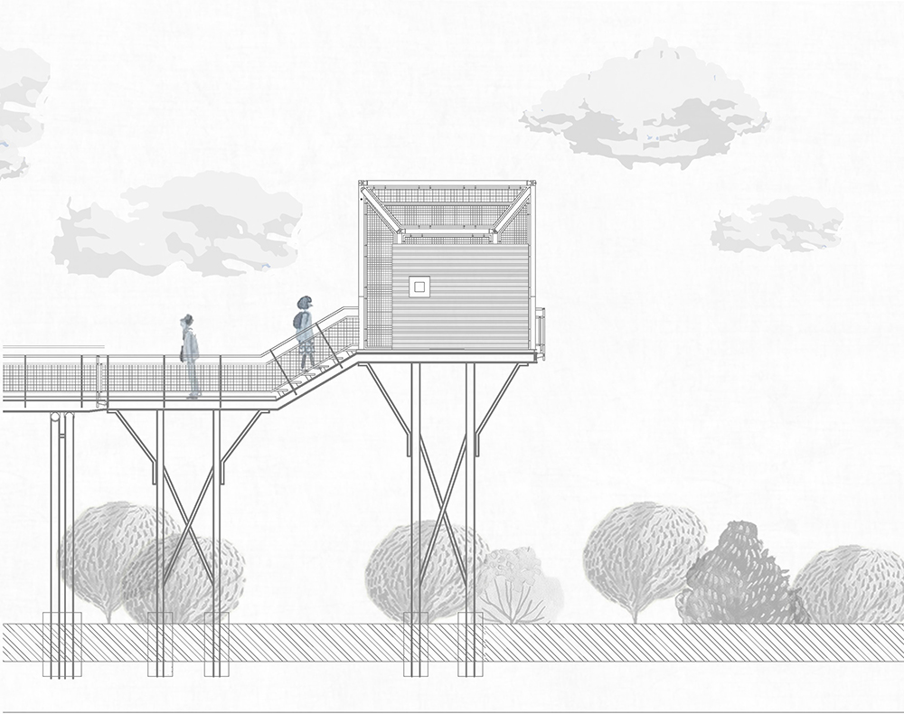 原有之地坪為泥土,紅磚及部分混凝土粗底,加上多年荒廢落葉、落葉及樹根佈滿全區,若要形成流暢的動線,除非全區更新地坪及屋頂,否則無法完全禁絕雨水及落葉,但如此一來,反而破壞了樹屋特色。對此我們設計了棧道的系統,可上可下,時左時右,並根據現場林勢,設置了三組昇於屋頂之上的觀景瞭望台,形成一處參觀者可以停佇環視的場所。這一組系統為可拆組的構件,只須於現場作組合安裝,得以降低對生態的干擾。