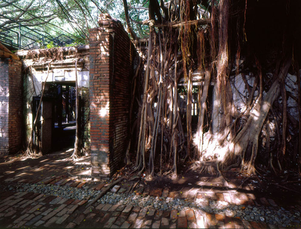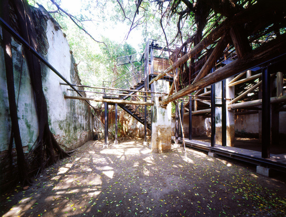 《安平樹屋》以立體公園詮釋歷史建築修復(認知的),在廢墟環境中置入以屋面為新地平線的空橋系統以及一組相似不鏽鋼幾何量體、一組新舊拱圈作為異化對照(型態的),運用可移置的輕量基礎、輕量結構、研發榕樹氣根作為結構的可能性(構築的)。