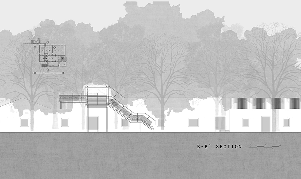 雙層界面:由於滲水、漏水的位置大致位於承重牆兩側,故除了將屋頂破損嚴重的空間視為室外空間處理。另在屋頂較為完整的空間中,作第二道玻璃牆,底部新作止水台度,重新界定出內、外邊界。如此將原有結構體與內外邊界合一體的情況,改變成兩者分離的狀態,如此降低了排水及維修的難度及成本。