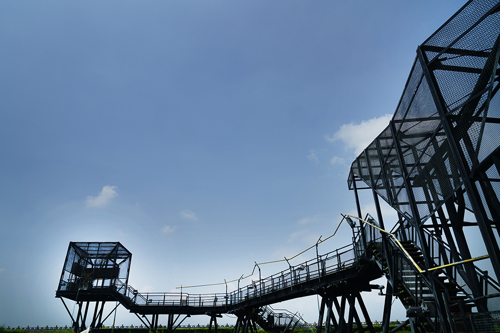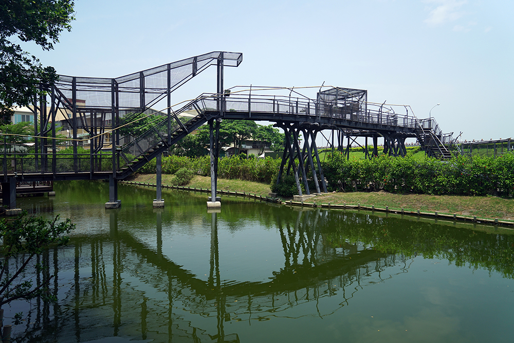 安平古運鹽碼頭觀景橋以樹屋為起點,整體設計以空橋系統為元素,建造出一座觀景橋。觀景橋以穿透式圍籬圍塑出一段尋找河流與古老渡頭的路徑,空橋系統使用鋼構與木構為基本結構元素,以 不喧鬧的造型自樹屋終點穿越漁塭連接至鹽水溪堤岸,作為樹屋印象的轉換與延續,而橋的盡頭是出海口框景的簡單量體與高度不同的平台,轉折的路徑在橋尾作控制視覺的縮放與停留,橋的盡頭嵌入量體造型的木盒子,製造視線在溪畔以框景的效果遠眺轉入鹽水溪之情境,讓鹽水溪生態視野與昔日運鹽碼頭的記憶在溪旁的堤岸展開。