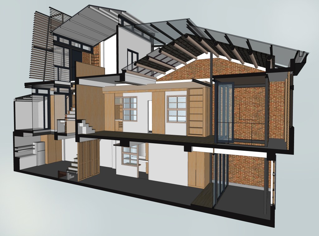 2.2.1原始格局:平面為座北朝南,如大多數此時期之連棟街屋一樣,是透過一室內狹窄走道、樓梯串連起7個房間。一樓最前面有一客廳/餐廳與最後面有一廚房/廁所/浴室的複合空間。環境擁擠而昏暗,僅南向臨小巷的房間光線較佳。垂直格局則分為前、中、後三段,前段為兩層樓雙斜屋頂、中段為三層樓雙斜屋頂、後段為兩層樓單斜屋頂。改造的主要手法如下: