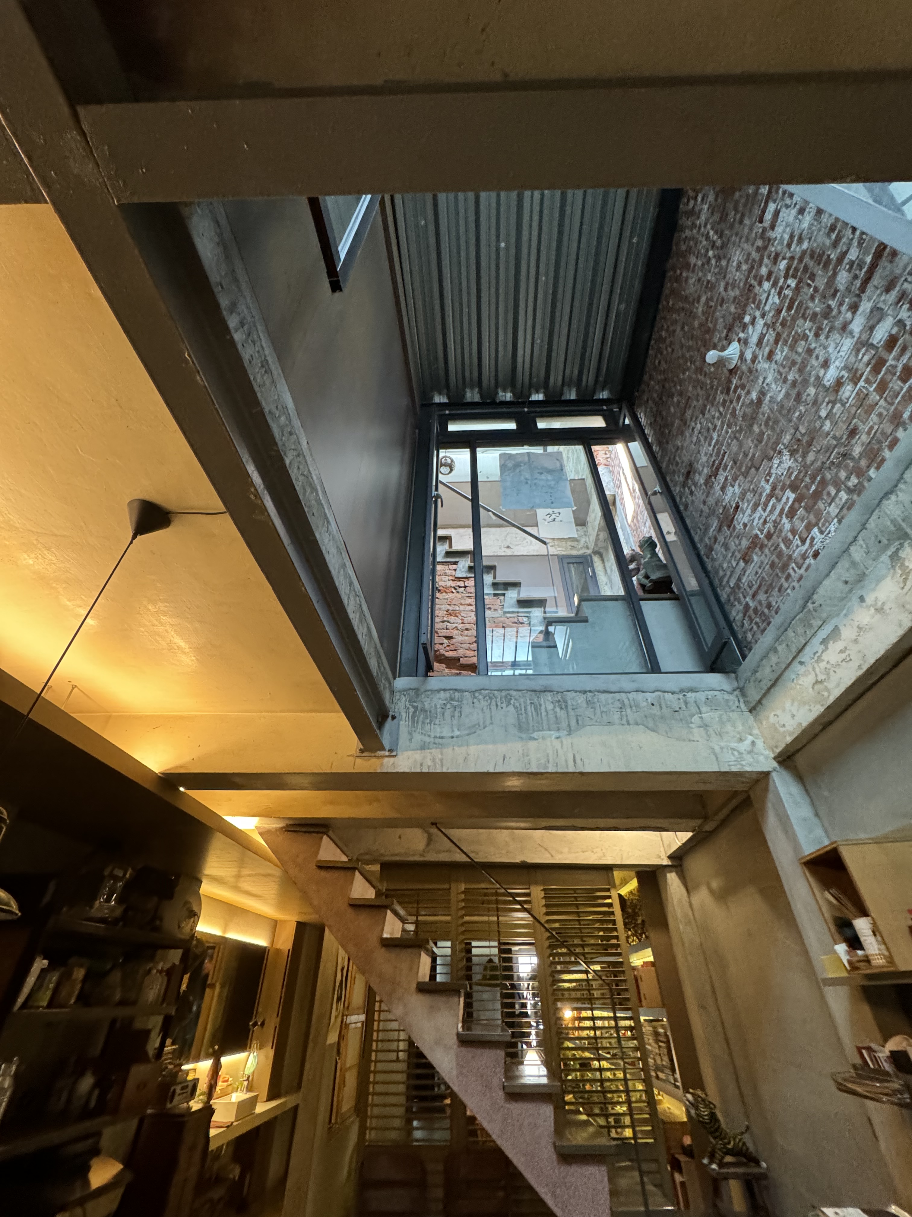 經由仔細檢討仰角視線後,於建築物二樓的前後兩端,在最小的切除範圍內,切穿出兩個天井:一方面可擴大前、後方光線在室內的覆蓋面積,並創造室內連續通風路徑。一方面更可讓人在一樓視線穿越二樓,並可看見三樓的舊立面。