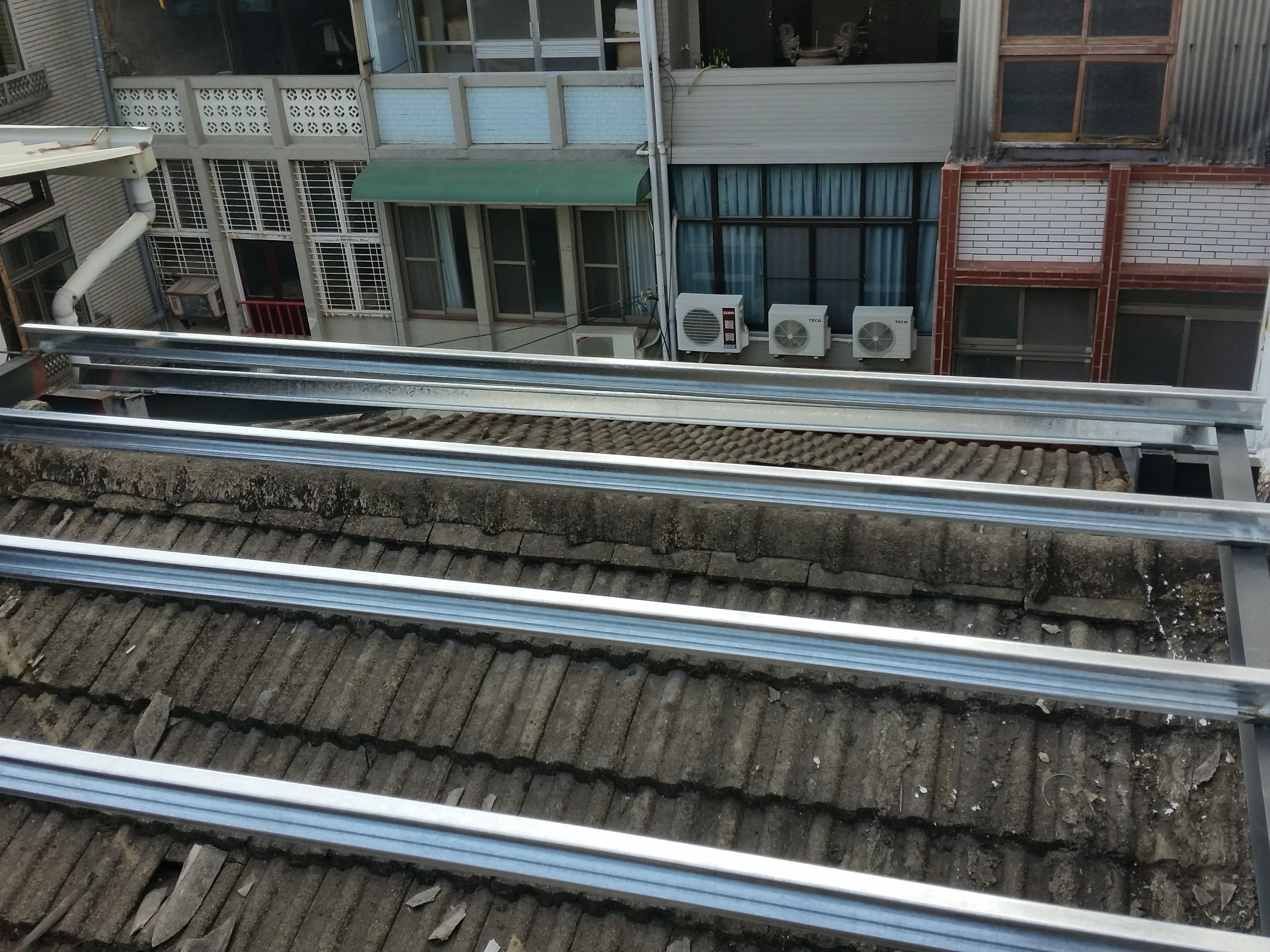 2.3.1雙層屋頂:在既有水泥瓦屋頂外側再新設一鋼構屋頂,形成一具阻熱、可採光的雙層屋頂。並藉由調整新設屋頂坡向,形成有效接續排流雨水的屋面。